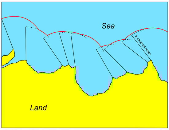 The threat posed by global sea level rise is of particular note here (see further below). Fundamentally, rising sea levels could potentially lead to substantial reductions in the scope of claims to maritime jurisdiction []. This is because the outer limits of maritime claims are delineated through distance measurements from baselines along the coast. Such outer limits are commonly constructed through the ‘envelope of arcs’ method [] (see Figure 3). Consequently, it is the outermost points along the baseline that will be relevant to the limits of the maritime zones. Significant sea level rise therefore has the potential to pose a distinct threat to critical base points from which maritime zones are measured and thus the extent of national maritime jurisdictional claims of states possessing low elevation coasts [].