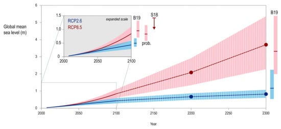 Predicted global sea level rise (GMSL) to 2300. Projections relate to a range of Representative Concentration Pathway Emissions scenarios (RCP), which reflect global mean temperature increases of between 2 and 5 °C. See original reference for details re-probabilistic modeling shown as bars such as S18 and B19. Note the ranges in estimated sea level rises of c. 0.2–1 m in 2100, and 1.7–>5 m by 2300. Acknowledgements: IPCC and Cambridge University Press for the use of this figure [].