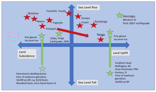 Moreover, areas such as Lifuka (Tonga) and Ranongga (Western Solomon Islands) have experienced earthquake-induced land subsidence and relative sea level land incursions and rapid land uplift with relative sea level retreat [,] (see Figure 6). More recently, data since 1950 with increasingly improving instrument resolution towards the present time record sea levels, for example from tide gauges and satellites, and land uplift/subsidence from GPS and satellite data [,]. These data give an overall pattern of sea level rise relative to land uplift/subsidence, even within the best-case scenarios of significant land uplift. Some islands, however, are more affected by anthropogenically forced sea level rise than others.