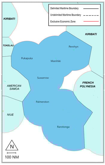 Pacific Island States, which possess some higher elevation islands as well as partially composed of low-lying reef features, are not in danger of complete inundation but can still be considered to be subject to high levels of vulnerability to sea level rise impacts. These include the Cook Islands and Federated States of Micronesia (FSM). With respect to the Cook Islands of its 15 islands, nine are low-lying atoll or reef island features with the remaining six being higher elevation features [,]. Indeed, around two-thirds of the Cook Islands EEZ claims are dependent on low-lying atoll island features, namely, Penrhyn Atoll, Manihiki Atoll, Pukapuka Atoll, Suwarrow Atoll, and Palmerston Atoll, all located in the northern part of the Cook Islands []. Concerning FSM, while there are high elevation features among each of the four major island groups making up the federation, Kosrae, Pohnpei, Chuuk, and Yap, numerous outlying and intervening low-elevation atoll and reef islands can be considered vulnerable to sea level rise. These include, from west to east, Ulithi Atoll, Eauripik Atoll, Pulusuk Atoll, Sapwuahfik Atoll, Minto Reef, and Kapingamarangi Atoll [,].