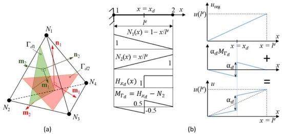 (a) Linear tetrahedron element with two intersecting discontinuity planes (,: normal and tangent vectors for cracks 1 ( ) and 2 (; Ni: interpolation function at node i); (b) Illustration of the displacement decomposition to regular and enhanced part and the corresponding functions in 1D case (: regular displacement; u: total displacement; ; displacement jump; : special function restricting the effect of inside the element).