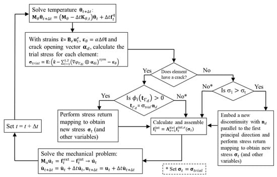 The discretized problem (Equations (4) and (5)) is solved explicitly in time with a staggered scheme [24]. Staggered solution means that, first, the new temperature vector is solved while keeping the displacement vector fixed, and second, the displacement vector is solved with fixed temperature vector. Equations (8)–(10) are solved with the standard stress return mapping. Figure 2 illustrates the flow of the solution process with the explicit Euler time integrator.