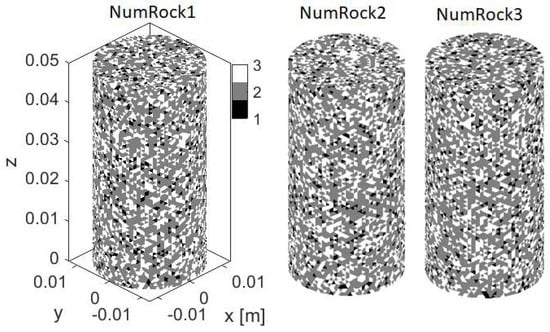 The rock heterogeneity is described by spatially random clusters of finite elements assigned to represent the constituent minerals in Table 1. The randomness in this heterogeneity description is generated as follows: An array with a length of the number of elements in the mesh containing integers 1, 2 and 3 (each coding a mineral in the mesh) is first created. The fraction (percentage) of each integer in this array corresponds to the fraction of the mineral in the rock. Next, this array is randomly permutated. A spatially random mineral mesotexture is obtained, as each entry in the array is also implicitly an element number in the mesh (1st entry is the element number 1 in the mesh etc.). Three realizations (i.e., developed with three different random permutations of the integer array just described) of numerical rock mesotextures (consisting of 206,617 elements) are shown in Figure 3. For example, the fraction of elements representing Quartz mineral in each numerical rock sample, having thus the material properties specific to Quartz in Table 1, is 0.33⋅206,617 ≈ 68,183. Finally, the shear retention factor in Equation (8) is β = 1, and the viscosity (Equation (9)) is set to sd = 0.001 MPa⋅s/m.