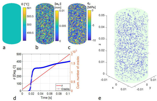 Simulation results for heat treatment (500 °C, NumRock1): (a) Temperature field; (b) Crack opening magnitude; (c) Stress-like softening variable; (d) Temperature and cumulative crack number evolution in time; (e) Thermally induced crack normal (every 100th plotted).