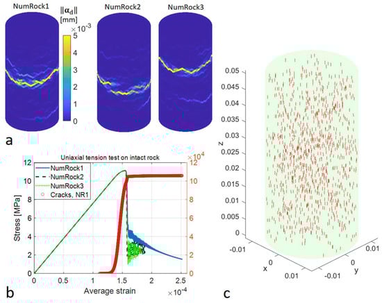 All the numerical samples have failed in the experimental transverse splitting mode, as attested in Figure 5a showing the magnitude of crack opening. It should be noted that there is a huge number of cracks all over the sample volume (Figure 5c), with a normal parallel (or closely so) to the loading axis, but only some of them open to create the final failure plane. Figure 5b shows the cumulative number of cracks, exceeding 100,000, as a function of the axial average strain for NumRock1. It also shows the stress-strain curves, which are strikingly similar; the tensile strength of each sample is 11.1 MPa. The reason for the insignificant deviation is likely the small element size.