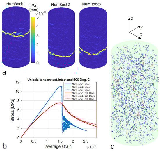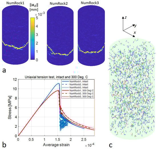 Heated (to 300 °C) samples all fail with a clear single fracture plane, albeit at different locations from those without heating (compare Figure 6a to Figure 5a). Again, there is not much deviation between the stress-strain curves of the rock samples (Figure 6b) until the post-peak softening part. However, the nonlinear pre-peak part of the curves is, due to the presence of thermal cracks, considerably more pronounced than that in the non-heated case. The resulting tensile strength of the samples is ~9.6 MPa, which is 13.5% smaller than the intact (room temperature) strength. The crack normal plot in Figure 6c shows that a new crack (green color) is initiated in many elements with an unfavorably oriented thermal crack.
