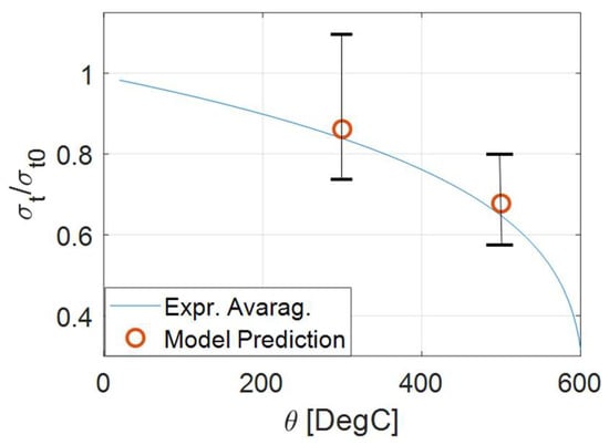Some features of the present model and the results are elaborated here. The simulation results are first compared to the experiments collected in [11]. For this purpose, the predicted normalized tensile strengths are plotted at different temperatures in Figure 8.