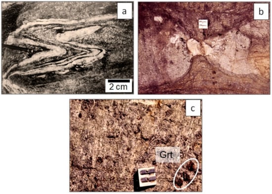 (a) Qz-rich folded veinlets, Val Seniciaga basement. (b) Boudinage structure in a feldspars-rich layer, Val Seniciaga basement: (c) Grt-bearing rock (inside the oval) at the contact with M. Ospedale, upper Val Seniciaga.