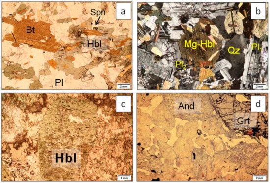 (a) Plane polarized light (PPL) image of green hornblende (Mg-Hbl), biotite (Bt) and sphene (Spn) in the plagioclase groundmass of MOD (sample A3357) (b) XPL image displaying two generations of plagioclase (euhedral phenocrysts, Pl1 and subhedral to anhedral crystals Pl2) in MOD (sample A3357). (c) PPL image of a hornblende phenocrystal (Hbl) from coarse grained MPD (sample A3355). (d) PPL image of M. Ospedale contact rock with garnet (Grt) and andalusite (And).