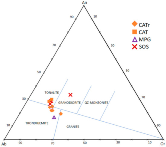 An efficient classification method for feldspathic igneous rocks is the MALI vs. SiO2 diagram (Figure 9; Frost and Frost, 2008 [78]). All Corno Alto-M. Ospedale rocks plot in the lowest calcic field close to the calcic–calc-alkalic boundary (some samples fall onto the boundary). Mafic samples plot left of the diorite field whilst CAT, CATr and SOS granitoids fall in the tonalite field or between tonalite and trondhjemite fields (as seen for Ab-An-Or diagram; Figure 8).