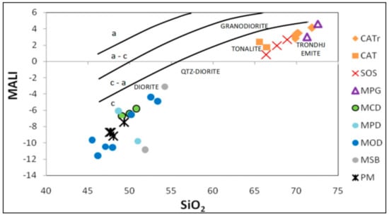 MALI classification diagram as a function of SiO2 [78]. MALI stands for modified alkali–lime index (Na2O + K2O–CaO). CATr = Corno Alto trondhjemite, CAT = Corno Alto tonalite, SOS = Sostino granodiorite, MPG = Monte Palone granite, MCD = Malga Campo diorite, MPD = Malga Persec diorite, MOD = Monte Ospedale diorite, MSB = Malga Seniciaga Bassa diorite, PM = Parental melts. PM samples are Re di Castello Parental Melts after [16,23,25,31].