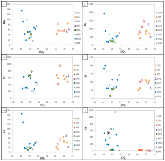 Harker diagrams display a typical trend of calc-alkaline series (Figure 11) [61]: MgO, FeOtot, CaO, TiO2 and MnO decrease as SiO2 increases owing to the early crystallization of mafic minerals. For instance, MgO and TiO2 decrease exponentially due the crystallization of early phases such as Mg-Hbl, while alkali oxides (Na2O and K2O) increase as result of the preferential segregation of alkali-rich phases, as SiO2 increases. High SiO2contents (>72 wt.%) are displayed by MPG, since M. Palone and M. Cornaccio are felsic differentiations of the main Corno Alto trondhjemitic body. On the other hand, SOS and CAT are slightly less evolved compared to the main CATr (65–68 vs. 69–71 SiO2 wt.%), also displaying higher average compositions for CaO, MgO and FeOtot (up to 5.01, 2 and 3.83 wt.%, respectively). These samples could represent a medium-to-late crystallization stage with segregation of Bt, Ms and andesine Pl. Comparing SOS with CATr, the former shows values SiO2, MgO, FeOtot, CaO and alkali values ranging from granodiorite (sample AO4) to trondhjemite (sample A77-10). Al2O3 values show a bell-shaped trend with the mafic flank of the curve being steeper than the felsic one. This is due to the higher modal abundances of Al-rich phases segregating at intermediate silica content. Samples showing P2O5 peaks also have high La contents, owing to higher modal proportions of Ap.