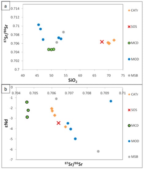 In the plot SiO2 versus 87Sr/86Sr (Figure 11a), a first recognizable feature is the isotopic similarity between MCD and the mafic parental magmas from the literature (87Sr/86Sr < 0.705) (Table 4 and Table S4). Such Sr isotopic compositions underline a lithospheric mantle affinity for MCD [61]. In contrast, the other mafic lithologies from Corno Alto, which include MOD (except for two samples), MSB and MDP, have more radiogenic values than MCD that are similar to the most differentiated units (SOS, CAT and CATr) within the interval between 0.7054 and 0.7082. A little amount of crustal contamination (assuming a crust with 87Sr/86Sr > 0.735) may have affected the trondhjemites, granites and granodiorites, according to Del Moro et al. [8]. The diagram Sr isotopic ratio vs. εNd (Figure 11b) shows that among the considered rock suites, only the Southern Re di Castello gabbro reveal mantle affinity with εNd > 0 and low 87Sr/86Sr (Figure S11b). Additionally, MPD and MCD show εNd ≈ 0 or slightly negative and low to medium 87Sr/86Sr values thus displaying little amounts of crustal assimilation. CATr, CAT, SOS and MOD lie in the εNd < 0—high 87Sr/86Sr sector, emphasizing crustal assimilation (Figure 11b).
