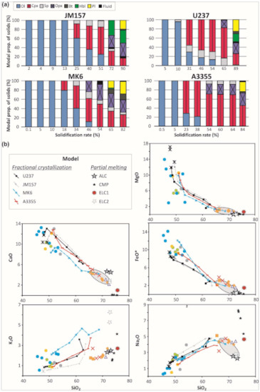 The four selected parental magmas start the crystallization of Ol at temperatures between 1190 and 1260 °C. Ol is the only phase present until 10–13% solidification, and is followed by the crystallization of Sp and Cpx between 10 and 50% solidification. Opx appears at different steps depending on the sample, as early as at 46% in MK6 and 54% in A3355, and later than >65% in JM157 and U237 (Figure 12a). Hydrous phases such as Hbl and Bt crystallize only after >65% crystallization. In particular, for sample JM157, Hbl is a significant phase reaching proportions between 28 and 32 modal%. Similarly, in U237, the amount of Hbl in the final steps of crystallization may reach 17 modal%. In contrast, MK6 contains only a few percent Hbl (2.5 modal%), and A3355 does not crystallize amphibole. Pl appears as early as at 65% of crystallization (MK6), but usually at >84% solidification. Simulations ended at temperatures between 820–850 °C.