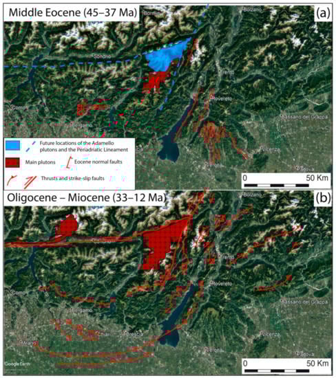The Adamello magmatism was continuously sustained over a 10 Ma-long period with major pulses at 43–42, 38–36 and 34–33 Ma [5,7]. The first pulse (43–42 Ma) partially overlaps the time span recorded for the emplacement of magmatic products in the Southern-Southeastern Alps [9,10,11,12,13,14]. The age of the later magmatic pulses is also consistent with emplacement of dykes and intrusive bodies in the Austroalpine and along the Periadriatic Lineament of Oligocene age [3,15].
