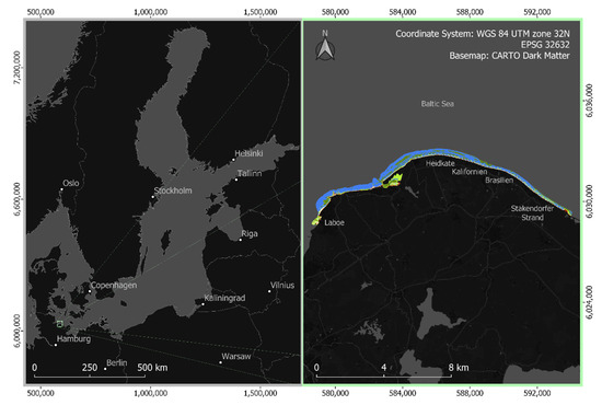 We conducted this study at the Baltic Sea beaches of the Probstei coast (Figure 1). The Probstei coast is an approximately 20 km long coastal area in the federal state of Schleswig-Holstein, Germany. We selected a subsection of the Probstei coast including the beaches of Mönkeberg, Heidkate, Brasilien, Kalifornien and Stakendorfer Strand. This section is a northward dipping open Pleistocene strip dissected by several channels up to 25 m depth [33]. This shallow coastal area is exposed to waves from west-northwest to northeast [34]. Changing winds and varying water level make this coastal lowland with its extensive sandy beaches prone to sea level rise and extreme storm surges [35]. Therefore, coastal protection structures characterize this area, which include a 14.3 km long dike and 48 large stone groynes made of erratic boulders. Every 200 m, one of these T-shaped groynes extends up to 100 m into the Baltic Sea [33]. The Probstei coast shows a typical seasonal mobility of sediment with the lowest mobility occurring during the summer months (May to August) and the maximum during the winter period (November to February). The nearshore bar system includes up to four sand bars and extends seawards up to 700 m [34].