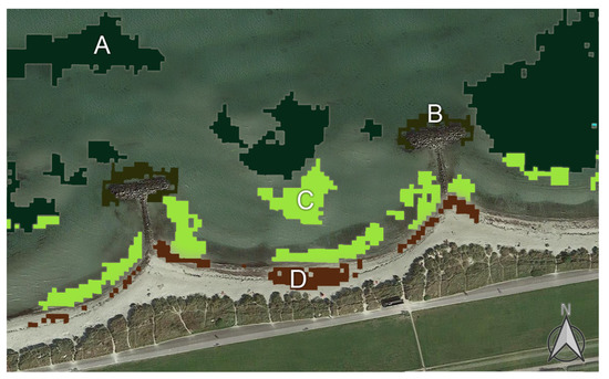 Schematic illustration of the typical zonation of the four dominant aquatic vegetation groups modified from PS data. (A—dark green) submerged seagrass, (B—moss green) fixed brown algae, (C—light green) drifting mix of seagrass and macroalgae and (D—brown) beach cast mixed of seagrass and macroalgae. Background map data: modified Google satellite.