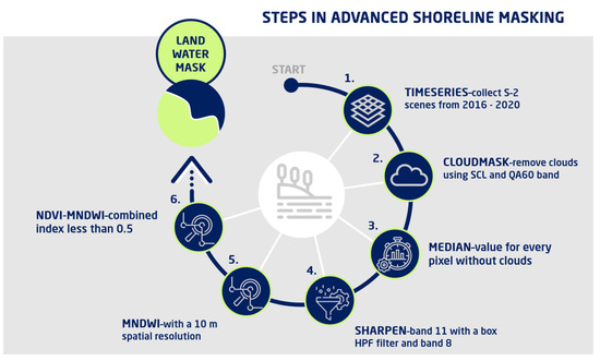 Afterwards, we calculated the median reflectance for each pixel considering all masked scenes. The result was a single median reflectance scene with a median determined without the influence of clouds, cloud shadows or snow. We then used this cloud- and cloud shadow-masked median product to calculate the Modified Normalized Difference Water Index at 10 m spatial resolution (MNDWI 10 m) [44]. The MNDWI 10 m extracts water pixels more accurately than a standard Modified Normalized Difference Water (MNDWI) index with 20 m spatial resolution [44]. The MNDWI 10 m is calculated using a sharpened band 11 (SWIR) and band 3 (Green) combination. The sharpening of band 11 consists of three steps: First, band 8 is filtered with a high pass filtered (HPF) to emphasize the high frequencies in the band [45]. Then, band 11 and the filtered band 8 are added. Finally, the sum of the bands is divided by two to determine the average reflection. Contrary to the results from Du et al. [44], HPF data showed best results for land-water masking in this study. As high pass filter, we used a 3 × 3 box filter with a kernel center of 1.6 and a surrounding weight of 0.0625 based on the approach introduced by Chavez Jr. et al. [46]. We sharpened band 11 by using spatial and spectral information from the 10 m band 8. Band 11 has a spatial resolution of 20 m and band 8 has a spatial resolution of 10 m. By sharpening band 11 with band 8, we create a new sharpened band 11 with a spatial resolution of 10 m and a combined spectral information from band 11 with band 8. This procedure is similar to the established pansharpening. However, since S-2 has no PAN band, the finer spatial information is obtained from band 8 instead of a PAN band. Then we calculated the difference between the Normalized Difference Vegetation Index (NDVI) and the MNDWI to extract water pixels as introduced by Zhou et al. [47], but using the MNDWI 10 m instead of the MNDWI. Finally, we extracted the dry beach together with all water pixels by creating a mask that retains all pixels with an NDVI-MNDVI 10 m less than 0.5 (Figure 3).