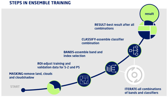 In the last years, remote sensing techniques have become an extensively used method for macrovegetation mapping [13,14] providing good estimates of aquatic vegetation coverage [15,16]. Moreover, remote sensing can provide long-term data to better understand ecosystem structures and changes [17]. Especially spaceborne datasets are an important time-saving supplement to traditional field surveys and offer lower costs per square kilometer [14]. Various techniques have been applied for vegetation mapping in aquatic environments, for example thresholding, spectral indices, regression analysis, visual interpretation or unsupervised classification. However, supervised classifiers remain the most common approaches, such as the maximum likelihood classification, the spectral angle mapper, the support vector machine and, in recent years, the random forest classification. In typical study arrangements, the authors apply two to three approaches independent of each other. Afterwards, they compare the classification results to determine the best approach [18,19,20,21,22]. Studies focusing on terrestrial surfaces, however, indicate that an ensemble of classifiers, i.e., the combination of multiple classifiers to a joint model, may be more accurate than any of the single classifiers [23]. Nevertheless, there is no study addressing the use of ensembles for beach cast and drifting vegetation assessment.