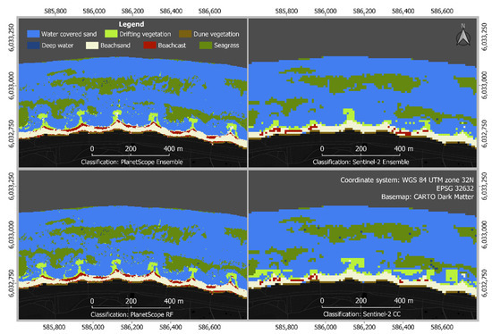 We also noticed that in general the classifiers performed very well for the additional classes (deep water, water covered sand, dune vegetation, seagrass). Therefore, our accuracy assessments achieved high overall accuracies, even though our target classes rarely reached high F1 scores. As a consequence, we had to pay special attention to the class-specific quality measures. Table 1 and Table 2 show, that only the RF classification and the CC achieved F1 scores above 0.8 for beach cast and drifting vegetation. This indicates, that only considering band and index combinations is not sufficient to achieve classification accuracies comparable to current studies of aquatic vegetation. Sun et al., 2021 achieved F1-scores above 0.9 for the detection of Ulva prolifera and Sargassum from Landsat 8 OLI imagery [66]. Additionally, Zhongfeng et al., 2018 reported F1-scores above 0.9 for the detection of macroalgae blooms using machine learning with Multi-Layer Perceptron [67]. It is therefore necessary to also evaluate the ensemble of classifiers in order to improve the accuracies of the target classes (Section 3.5). The most suitable band combinations were B1, B2, B3, B4 and B8 for S-2 and all bands of PS. The classification results presented in the following section are based on these band combinations.