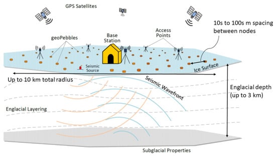 The flow of glaciers and ice sheets, as well as the drainage of surpa-glacial lakes and the calving of tidewater glaciers, are associated with natural seismicity [24,25,26,27,28]. Measuring these events (which generally occur in areas that are difficult to access) at high spatial and temporal resolution requires a dense network of stations that can record data at high sampling rates. The geoPebble nodes are capable of recording events that can have frequencies on the order of 102 Hz. Each geoPebble node is an integrated sensor that can measure three of the most important geophysical parameters needed to improve our knowledge of glacier and ice-sheet flow: a seismic image, a position image, and a seismicity image. Although these can each be measured with existing devices, they are done so more coarsely, without 3D information, and at great expense and logistical effort. Measuring these parameters concurrently, which is rarely done (even at coarse resolution), will result in a fundamentally new view of the ice sheet—the whole is greater than a sum of the parts.