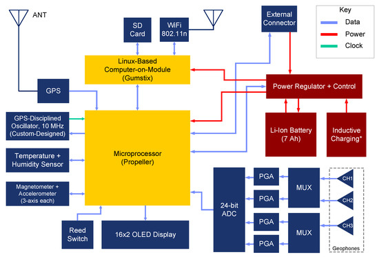 A straightforward power regulation circuit was designed both to allow the 7-Ah Li–Ion battery to charge and to condition and distribute the required power to the geoPebble node’s subsystems. With all systems operating, the geoPebble node uses about 2 W of power. As mentioned above, future geoPebble versions may include inductive-charging capability. We have demonstrated this capability using an earlier version of the Qi standard that could provide only 5 W, but which charged the geoPebble node too slowly for use in the field.