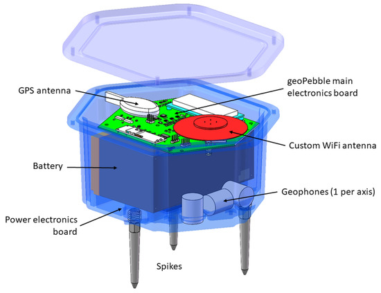 The geoPebble node hardware consists of a three-axis geophone, four channels of 24-bit digitizer, low-power microprocessor, computer-on-module, GPS receiver, 32-GB local data storage, power unit, wireless transceiver, and two antennas (for GPS and WiFi). A block diagram of the geoPebble is shown in Figure 2, and the final board layout is shown in Figure 3. The three-axis geophone measures the reflected seismic wave and outputs an analog signal that is fed into the 24-bit sigma–delta analog-to-digital converter (ADC, with crosstalk of dB at 10 kHz) that converts the analog signal into digital data that can be stored and later processed and analyzed. The GPS receiver gathers time and geoPebble node location data. The digital data along with the GPS data are stored in the geoPebble node’s non-volatile memory and are also transmitted via the wireless transceiver to the base station. Each geoPebble node has sensors to measure temperature, pressure, and other environmental parameters. An external port enables extensibility of the geoPebble node by enabling the connection of external sensors and battery packs. Future extension for an inductive-charging capability (e.g., using the Qi standard) is provided (early versions of the standard were unable to provide significant power to rapidly charge the nodes, only 5 W; the current Qi version 1.3 can transfer up to 30 W). Each node within the geoPebble system costs about US$3000, not including the non-recurring engineering.