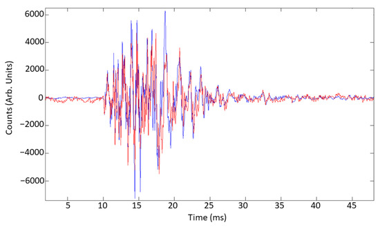 Raw seismic data from Whillans Ice Stream comparing geoPebble (red) with COTS Nanometrics Geode (blue).