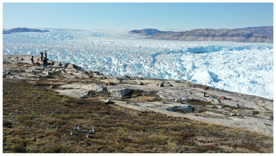 Base camp at the Helheim Glacier with the data-collection drone in the foreground.