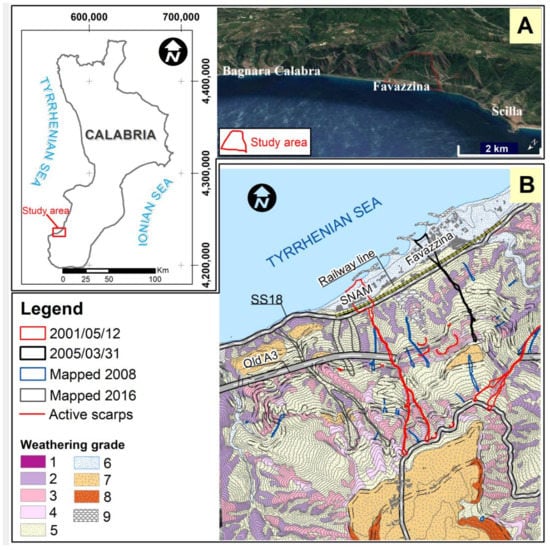The study area is located within the Costa Viola between the villages of Scilla and Bagnara Calabra (Figure 1A). It extends for about 1 km2 and is bordered at the top by “Piano delle Aquile” (a flat area of marine origin) and at the bottom by a densely urbanized coastal plain including the Favazzina village (Figure 1A).
