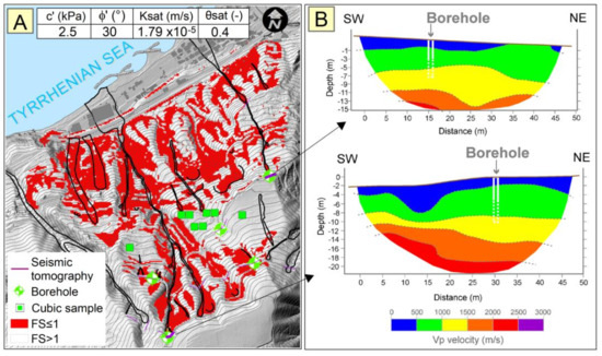 Landslide risk management is a complex process that first involves analysing the risk [1]. Risk analysis is comprised of different consequential steps that ordinately deal with susceptibility, hazard and consequence analyses; finally, the risk is estimated. Focusing on susceptibility analysis, specifically aimed to determine the spatial probability pertaining to a given type of landslides in a certain area, methods to be adopted can be heuristic or knowledge-based, empirical/statistical and deterministic/probabilistic according to the scale of zoning, provided that predisposing factors are properly identified [2,3,4,5,6]. At large (1:25,000 to 1:5000) and detailed (>1:5000) scales, adopting deterministic/probabilistic methods allows simulating the physical process that governs the triggering mechanism of investigated landslides, based on an accurate geotechnical characterization of the involved soils.