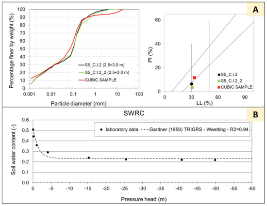 Results of laboratory tests on weathered gneiss of class VI. (A) Grain size distribution and plasticity chart; (B) soil-water retention curve (SWRC).