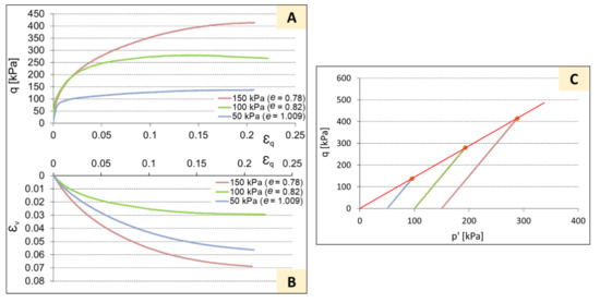 With reference to mechanical properties, the results of drained triaxial compression on undisturbed soil specimens were used to generate the soil strength envelope in saturated soil conditions. These results were represented on the q–εq and εv–εq planes (Figure 4A,B) and on the q–p’ plane (Figure 4C), where q is the deviatoric stress, p’ is the isotropic effective stress, εq is the deviatoric strain, and εv is the volumetric strain. The curves highlight a ductile and contracting behaviour. The obtained shear strength parameters were equal to c′ = 1 kPa and ϕ′ = 35°.