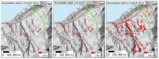 If the position of the initial depth of the groundwater table rose, i.e., in the cases when it was located at 2.5 m and 2.0 m from the topographic surface (Figure 6, cases 2U and 3U), the number of cells that resulted “unstable” tended to increase, but with a very limited gain with respect to that in the previous case 1U. Indeed, as Table 2 shows, in these cases 1U and 2U, the values of TPR equalled 0.08 and 0.14, respectively. On the other hand, in the case 3U, the value of TPR equalled 0.45.