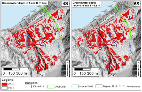 In saturated soil conditions, the TRIGRS results associated with the case 4S in Table 1 (Figure 7, case 4S) showed that the areas computed as “unstable” well matched the source areas mapped in the landslide inventory, except the area A01 that was among the ones related to the 2001 event. On the contrary, considering the case 5S in Table 1 (Figure 7, case 5S), it can be observed that TRIGRS allowed for correctly back-analysing the source areas mapped in the landslide inventory including A01.