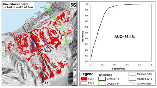 For case 5S, the AUC was also estimated to confirm the success of the TRIGRS analysis. In this regard, Figure 8 shows that the value of the area under the ROC curve plotted in the sensitivity versus 1-the specificity space was equal to 86.4%.