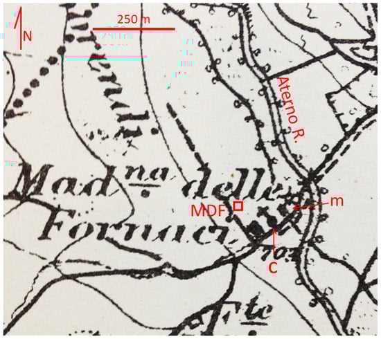Topographic map (period: February 1884; original scale 1:20,000) of the Madonna delle Fornaci (MDF) site in which the mill (m), the Madonna delle Fornaci church (c) and the investigated site (red square, MDF) are located.