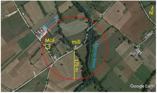 Map identifying the red circle with the radius of 175 m where the two sinkholes occurred during the 1703 earthquake are likely located. The ancient mill and the Aterno River are also highlighted. Within this area, the selected MDF site is located. In the most restrictive hypothesis, if a sinkhole had formed near the mill, the other must have been at least 175 m away. Therefore, the selected site for the investigations was chosen (i) within the area of a circle with a radius of 175 m; (ii) distant from the current riverbed of the Aterno River to avoid carrying out investigations in post-1703 alluvial deposits because close to the current riverbed, and (iii) for logistical reasons (accessibility for the borehole machinery, etc.).