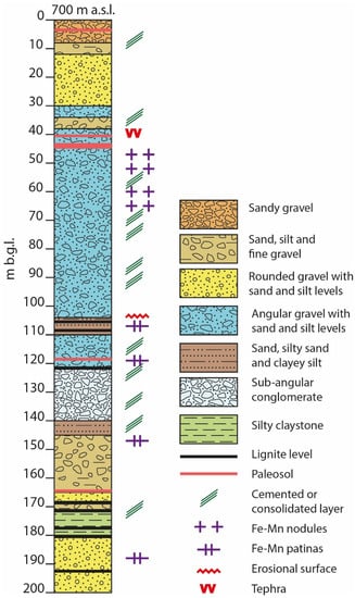 The top lithological unit is composed of braided fluvial floodplain deposits of the Aterno river interfingered with slope deposits, mainly gravel beds with a sandy matrix. This lithological unit contains horizontal fluvial gravels and sandy lenses with abundant Upper Pleistocene volcanic material permitting to date these units to the upper part of Late Pleistocene and Holocene (PHU) [56,59].
