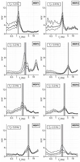 Mean noise HVSRs (thick lines) and standard deviation curves (dashed lines) at the MDF1-8 sites. It must be noted that the MDF1 measurement was acquired in the MDF site which is the location with the lowest resonance frequency (around 1.2 Hz) obtained. For the location of the measurements, please check Figure 5.
