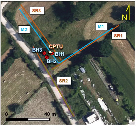 Plan view of the field investigation at the MDF site. BH = borehole; M = MASW; CPTU = cone penetration test; SR = Seismic refraction.