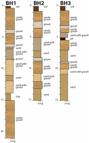 The stratigraphic logs of boreholes BH1, BH2, and BH3 (Figure 9) indicate the predominance of coarse-grained materials in the shallowest portion of the soil deposits at the MDF site, down to the maximum investigated the depth of 21 m. The soil profile is mostly composed of alternating layers of dense gravel and sand with gravel, particularly in the upper 6–7 m, while sand layers are also encountered below this depth. A significant lateral variation, typical of alluvial deposits, can be observed from the borehole logs, despite the short mutual distance (about 2–3 m) among the boreholes.