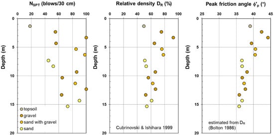 Figure 10 shows the depth profile of the SPT-N blow counts obtained in borehole BH2 and their interpretation in terms of relative density DR [78] and peak friction angle ϕ‘p, estimated from DR using the [79] relationship. The gravel and gravelly sand layers up to 6–7 m depth are characterized by rather high values of relative density (DR ≈ 60 to 90%) and peak friction angle (ϕ‘p ≈ 40–42°). The predominantly sandy layers from about 6–7 to 15 m of depth are moderately dense (DR ≈ 50–60%, ϕ‘p ≈ 36–37°).