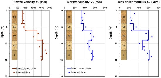 P-wave and S-wave velocities obtained from down-hole test (borehole BH2); SG: sandy gravel; GS: gravel and sand; S: sand.