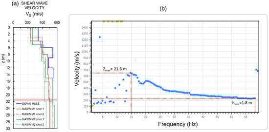 Figure 12b shows the dispersion curve obtained from the MASW. Identification of the maximum depth, zmax = 21.6 m (half of the maximum investigated wavelength according to [81]) for which the velocity measurements are reliable, induced to neglect the velocity values deeper than 20 m.