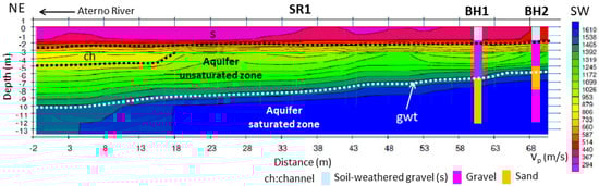 Figure 13 and Figure 14 show the interpretation of the seismic refraction surveys SR1 and SR2 carried out along perpendicular alignments, in terms of contours of the P-wave velocity. The SR1 and SR2 were acquired during summer 2020 when the water table was about 7 m b.g.l. The interpretation of SR1 and SR2 in terms of VP contours was carried out by using the log of BH1 and BH2 boreholes and considering the water table depth at about 7 m b.g.l. VP contours highlight the shallow 2–3 m-thick layer formed by fine-grained deposit and weathered gravel, possible buried channels in the aquifer formed by coarse-grained deposit, and the groundwater table. Below the VP velocity boundary of about 1500 m/s, which is the VP velocity of water, the saturated aquifer is placed. Above the groundwater table, the unsaturated zone of the aquifer is recognized. The SR1 interpretation also shows the plunging of the water table toward the Aterno River, with a hydraulic gradient of 5 ‰, demonstrating that it drains the aquifer (Figure 13).