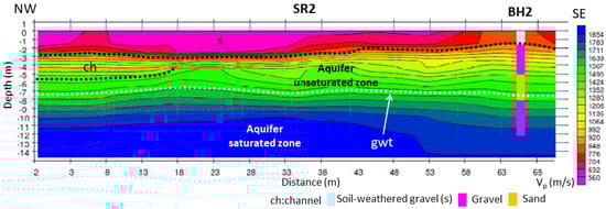 P-wave velocity, VP, contours of the SR2 seismic refraction survey and its geological interpretation. For the location see Figure 8, gwt: groundwater table; BH2 refers to the borehole.