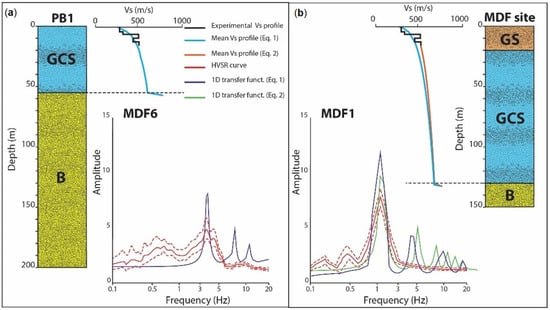 The PB1 borehole permits to define that the geological bedrock is deeper than 200 m b.g.l. Close to the borehole site, we realized the microtremor measurement MDF6, with an f0 value of 3.16 Hz, which indicates the main impedance contrast between 30–60 m deep [76,77]. Definitively, the impedance contrast highlighted by microtremor measurements is not generated by softcover continental deposits over the geological bedrock but is contained inside the continental deposits. This impedance contrast is probably due to the presence of LPU covered by the softer sediments of MPU and PHU (Figure 4 and Figure 5). Under this assumption, the seismic bedrock at the MDF site is considered deeper than 100 m based on the MDF1 measurement with f0 = 1.23 Hz [76,77]. This hypothesis has been verified, as reported in the subsequent sections.