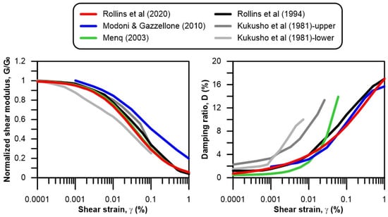 - Rollins, K.M.; Singh, M.; Roy, J. Simplified Equations for Shear-Modulus Degradation and Damping of Gravels. J. Geotech. Geoenvironmental Eng. 2020, 146, 04020076. [Google Scholar] [CrossRef]