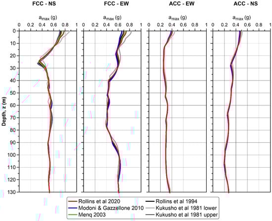 - Régnier, J.; Bonilla, L.F.; Bard, P.Y.; Bertrand, E.; Hollender, F.; Kawase, H.; Sicilia, D.; Arduino, P.; Amorosi, A.; Asimaki, D.; et al. International benchmark on numerical simulations for 1D, nonlinear site response (Prenolin): Verification phase based on canonical cases. Bull. Seismol. Soc. Am. 2016, 106, 2112–2135. [Google Scholar] [CrossRef]